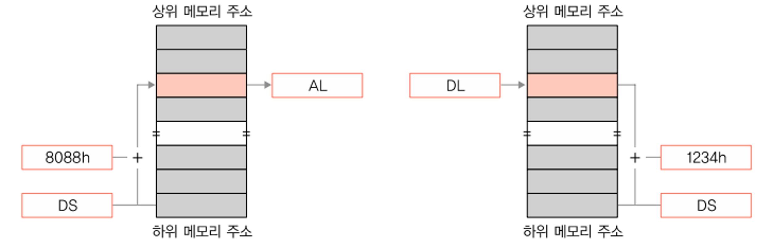 - DS:[8088h]와 DS:[1234h]는 각각 ‘세그멘트:오프셋’형식의 메모리에 직접 접근하는 방식