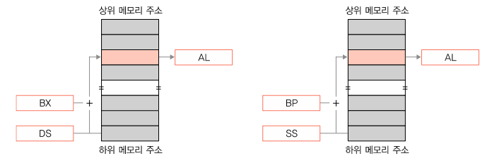 - 실제 주소 생성 위해 베이스 레지스터(BX 또는 BP)와 인덱스 레지스터(DI 또는 SI)를 결합