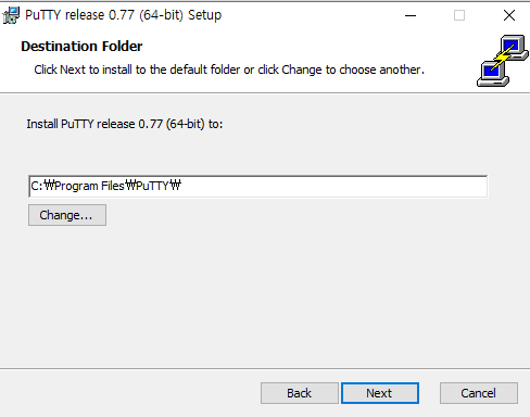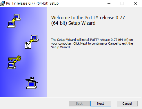 Putty 설치파일 실행화면이고, Next 클릭합니다.