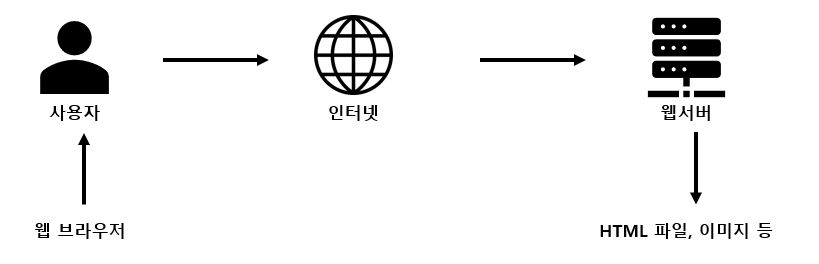 아래의 그림과 같이 사용자는웹브라우저로 접속하고,인터넷을 통하여 웹서버는 요청받은웹페이지(HTML, 이미지 등)를 보내주게 됩니다.