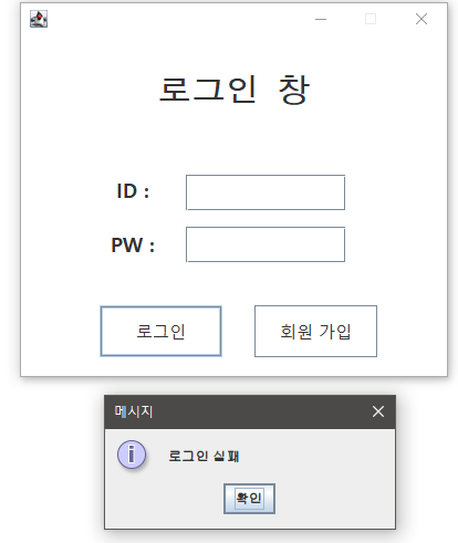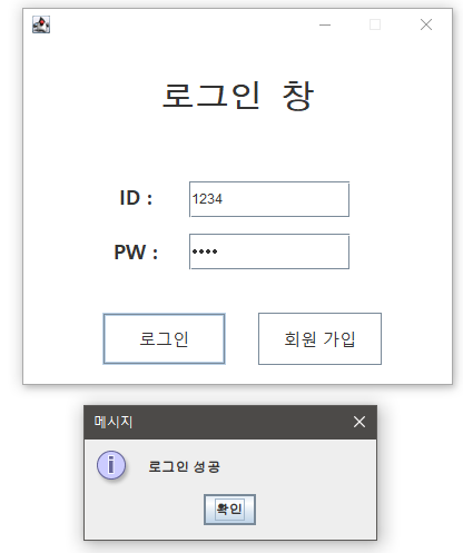 GUI에서 입력한 ID, Password가 DB에 있는지 확인하는 메소드이다. 성공 시 1을 리턴하고, 실패시 -1을 리턴합니다.