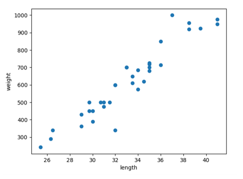 산점도 그래프를 그릴 수 있는 패키지인 맷플롭립을 import한 후 산점도를 그리는 함수인 scatter을 사용하여 xlabel, ylabel 함수를 이용해 x축은 length, y축은 weight 이름을 표시하였고, show 함수를 이용해 그래프를 확인해봅니다.
