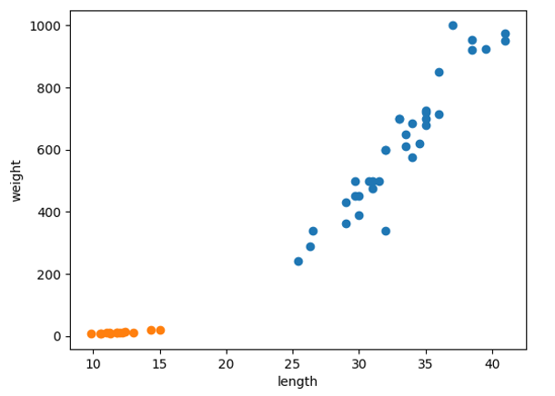 주황색 점은 빙어의 산점도, 파란색 점은 도미의 산점도입니다.
