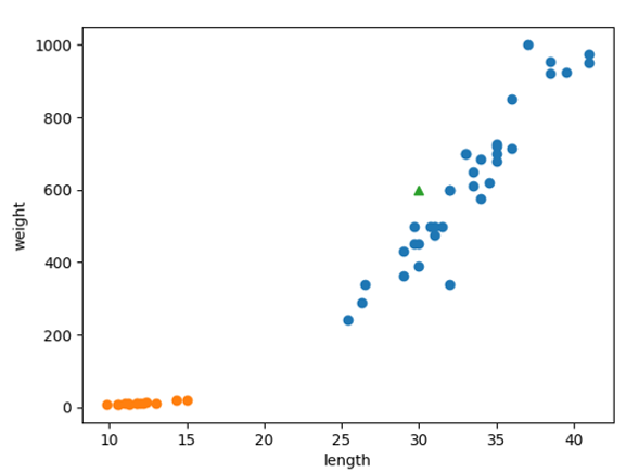 새로운 생선 데이터를 생성하여 삼각형으로 산점도 그래프를 그려 확인해봅니다.