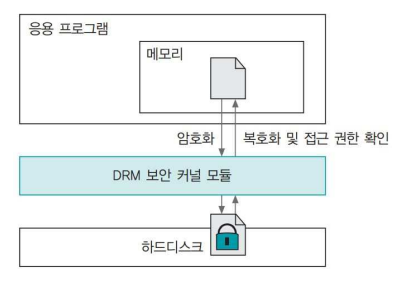 DRM 모듈로 운영되는 시스템의 하드디스크에는 암호화된 파일이 저장되므로 하드디스크를 도난당해도 보안상 위험이 적음
