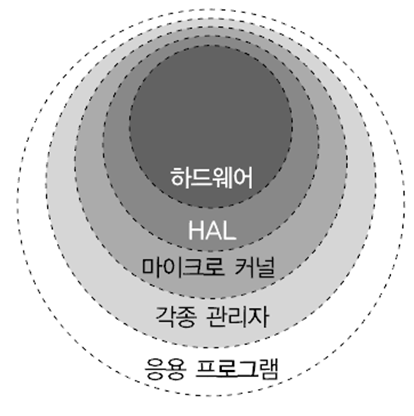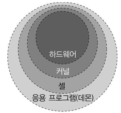 - 하드웨어, 커널, 셸, 응용 프로그램으로 구성