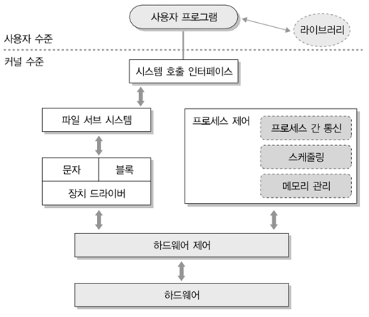 - 장치 드라이버: 윈도우에서 처럼 하드웨어와 소프트웨어를 연결해주는 인터페이스 제공